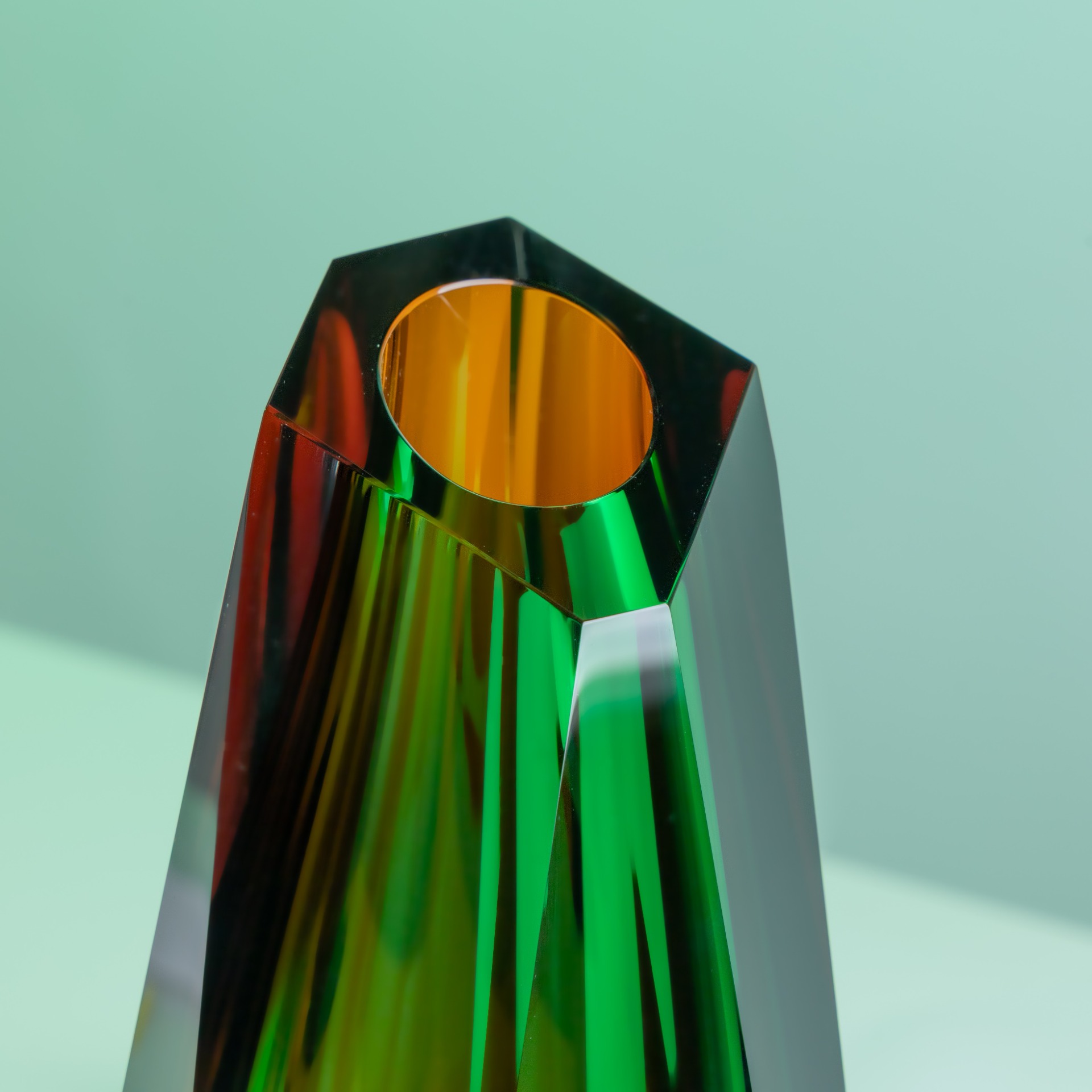 By combining molten crystal glass with ruby-colored pigments, a unique fusion of clear material and deep, saturated tone was achieved.