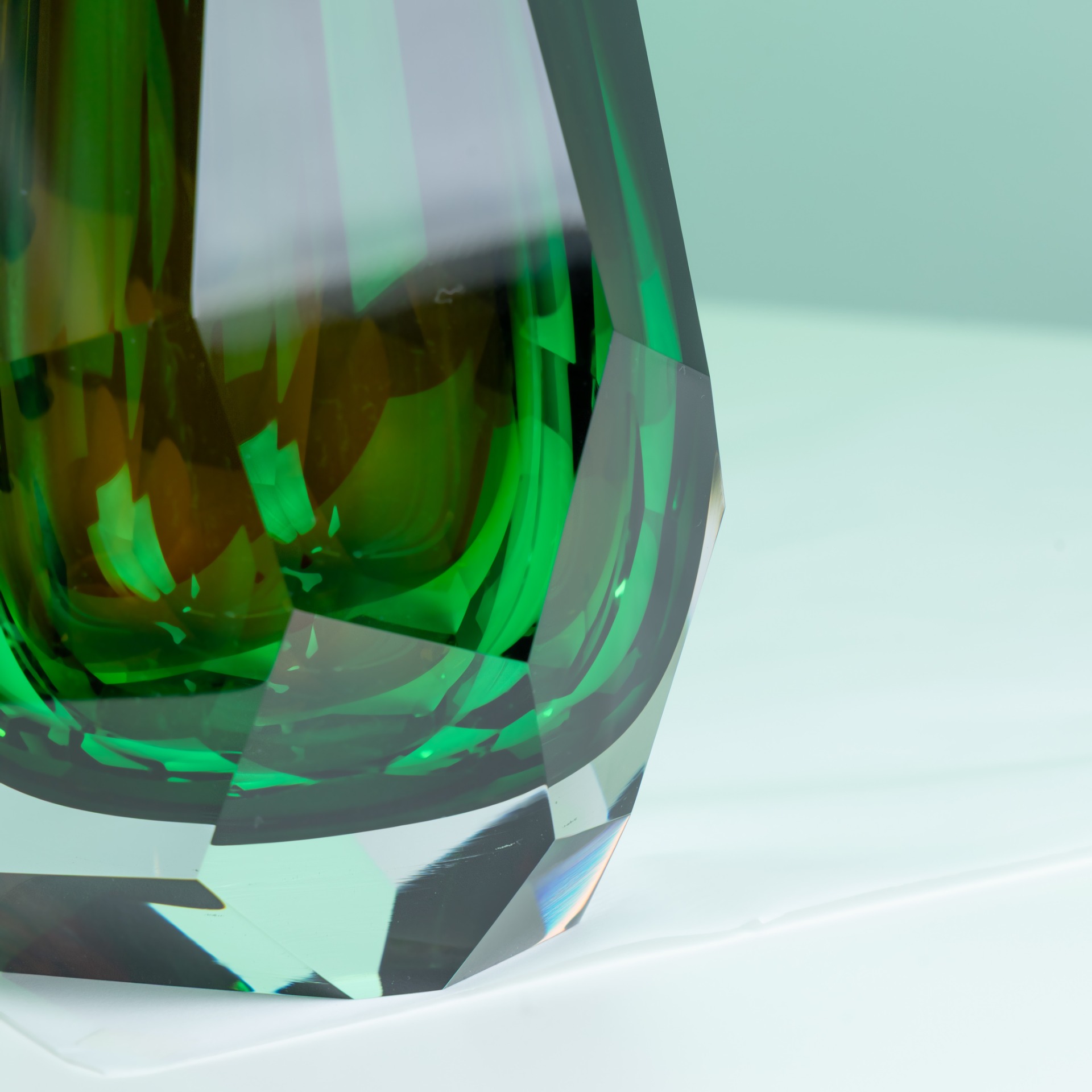 The final character of the vase is defined by dozens of precisely cut surfaces, all shaped by hand – individually, without templates. Its distinctive slanted neck enhances the form with dynamic energy and characteristic asymmetry.