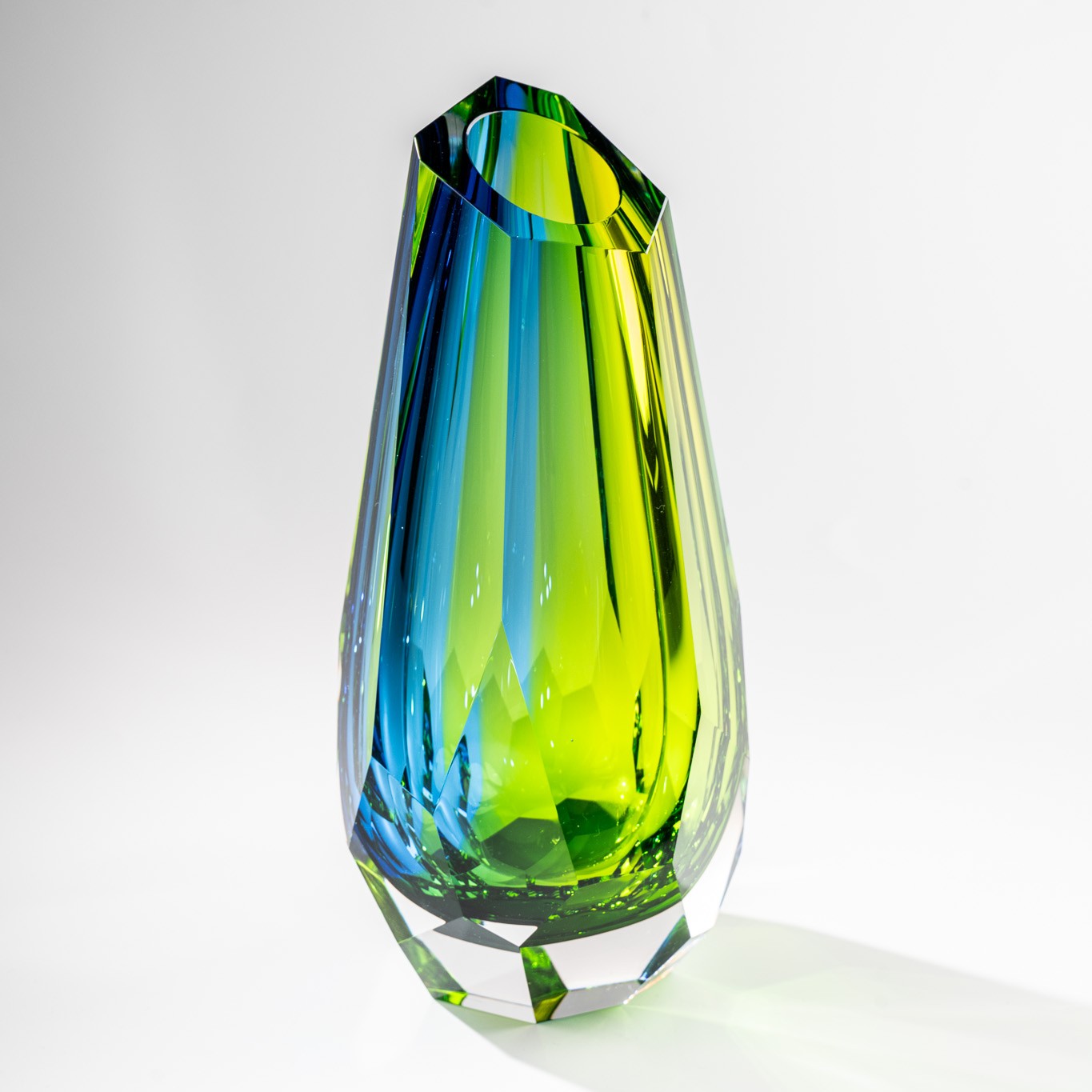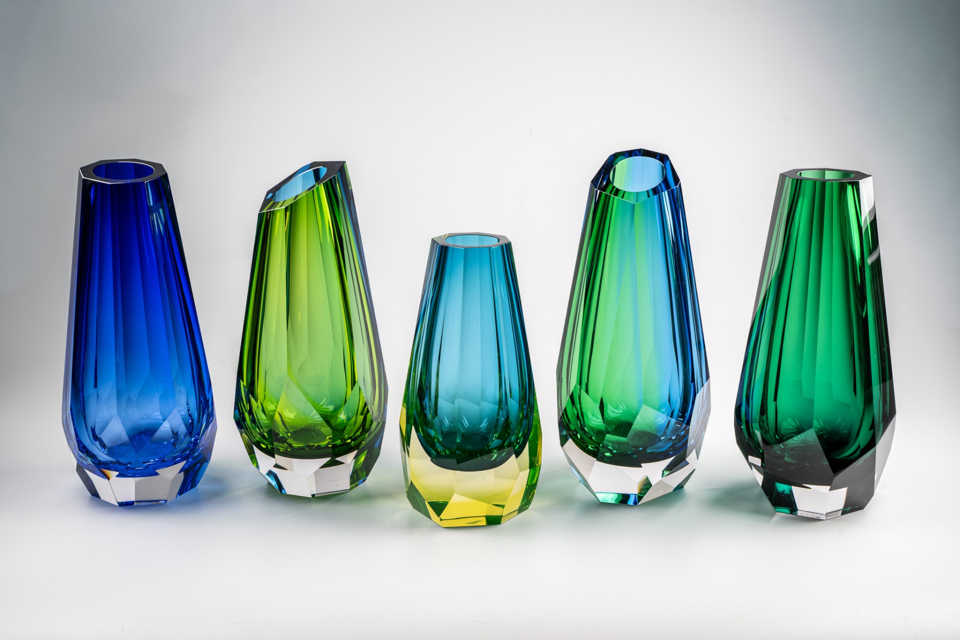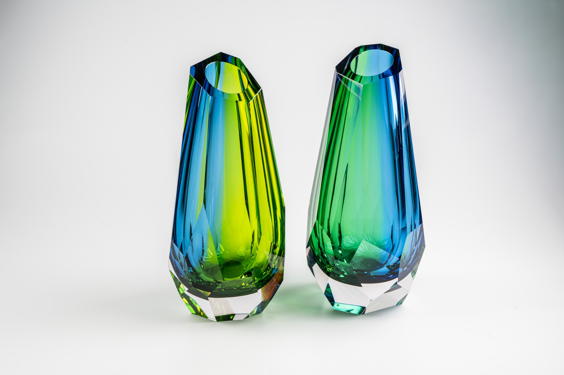 The final character of the vase is defined by dozens of precisely cut surfaces, all shaped by hand – individually, without templates. Its distinctive slanted neck enhances the form with dynamic energy and characteristic asymmetry.
